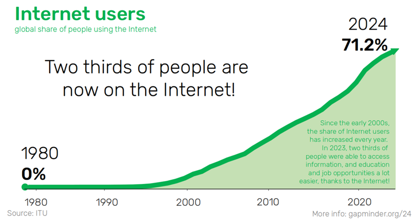 出典元となっているGapminderのページを確認するとしてみると2024年のデータが出ている。なんと71%の人が既にインターネットにアクセスできるらしい。
